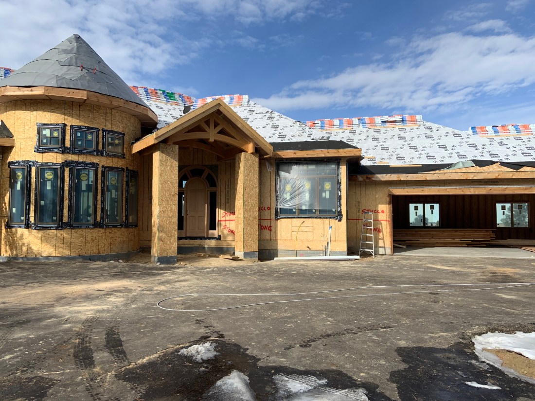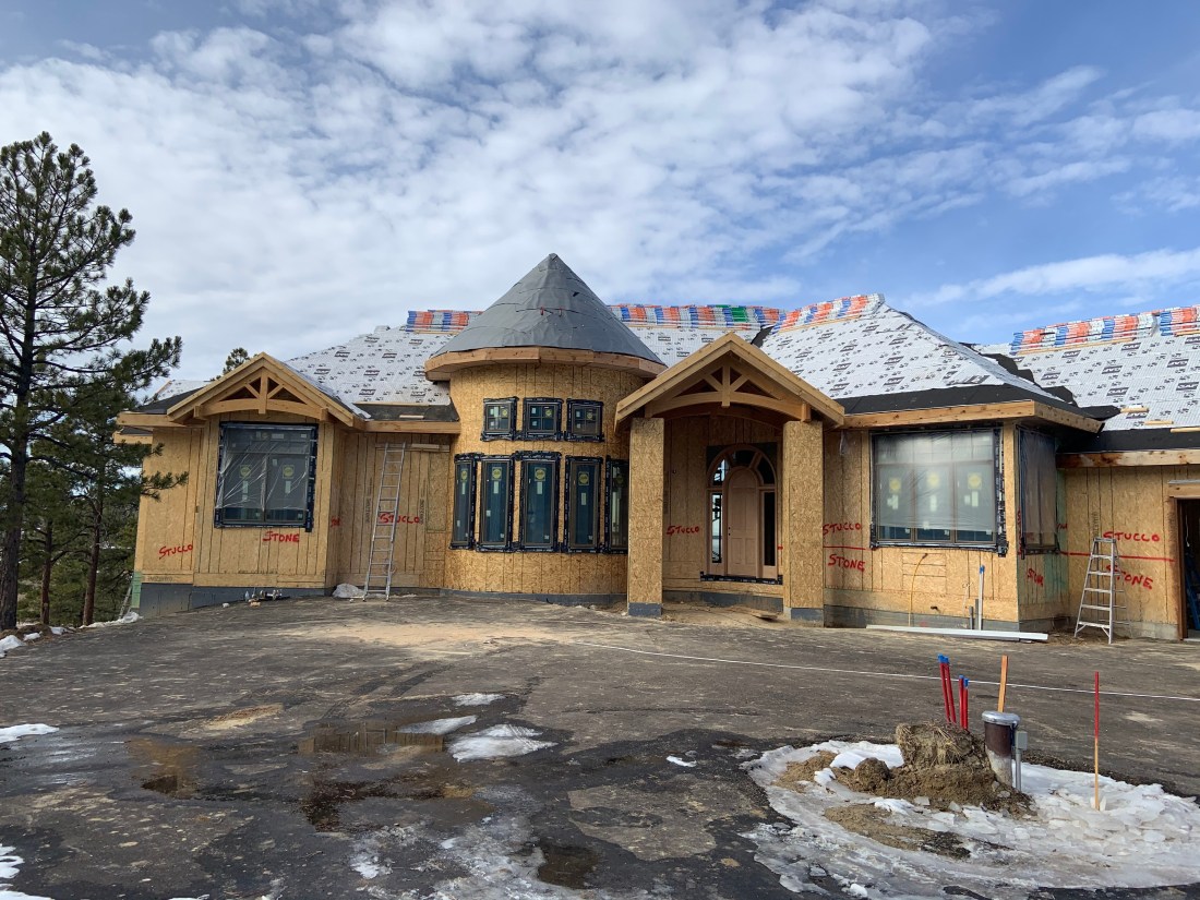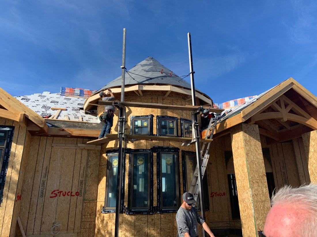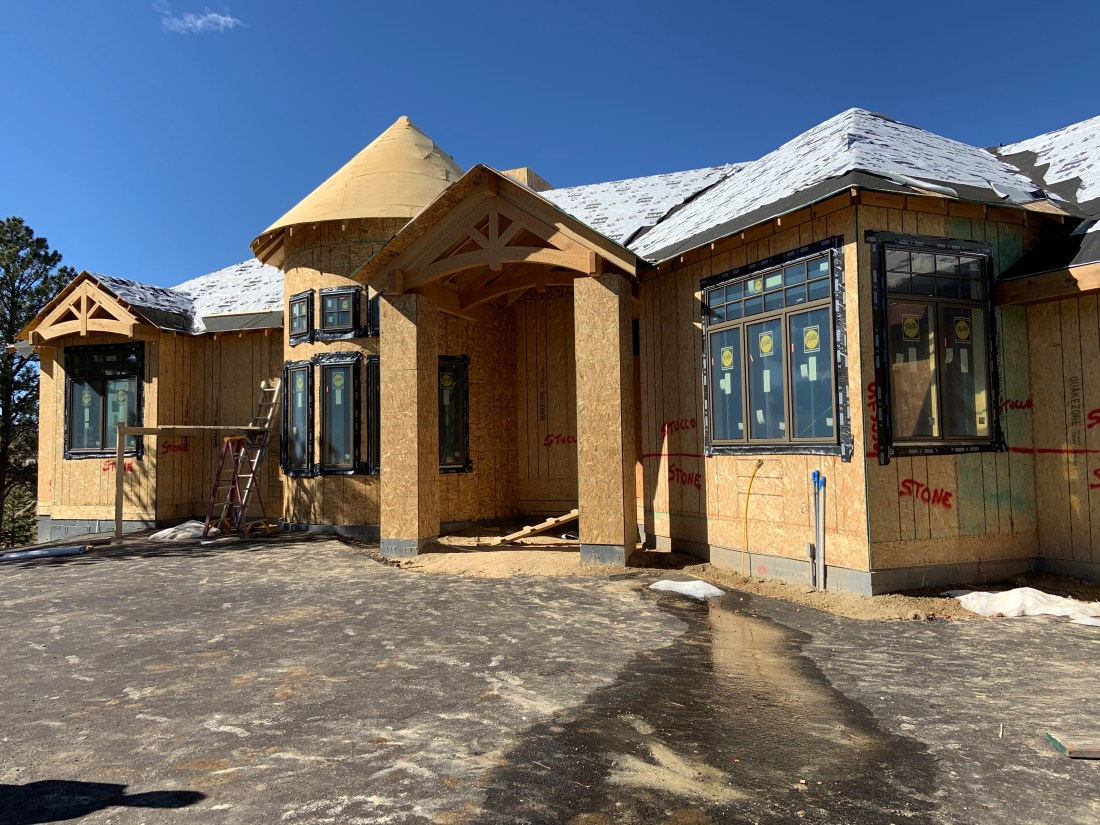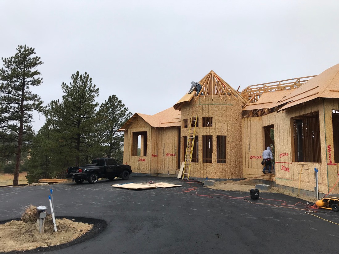 We have a turret roof! We were delighted to see our staircase turret come to life outside with the completion of the turret roof. In general, things are moving along nicely. Just before the site visit we had a project review meeting to confirm the major upcoming items and dates. Drywall starts next week and the propane tank will be filled soon….just awaiting inspection. Then the house can be heated! That’s so important when it’s winter in Denver!