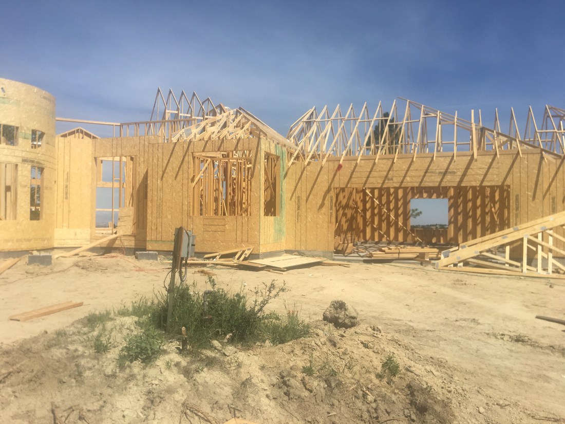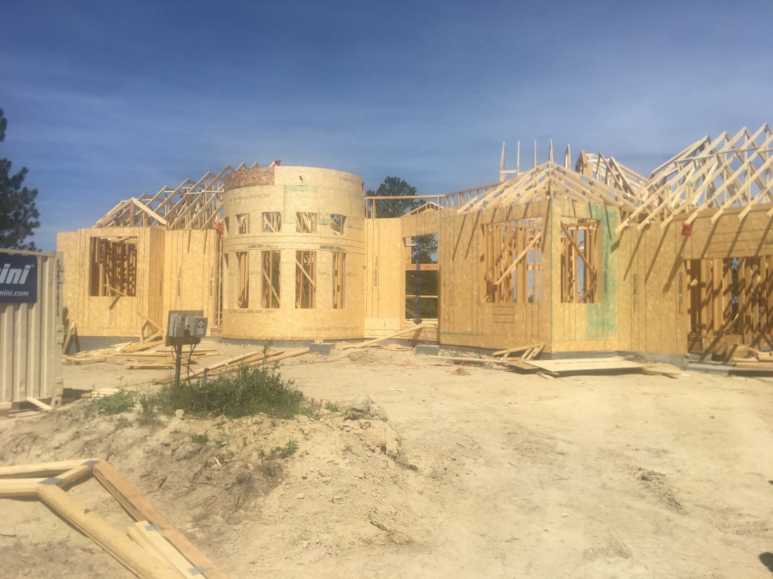 Beautiful day at the lot today. We were able to view the 3 big trusses that are being put into place…..two in the great room and one for the main deck. Now the final portion of the roof framing will completed and ready for the roof. HVAC system also being completed. Windows waiting to be installed