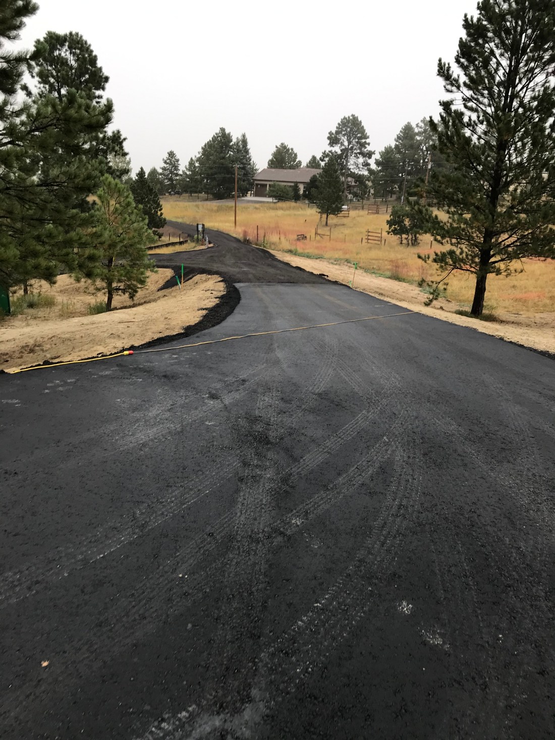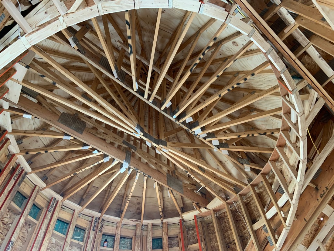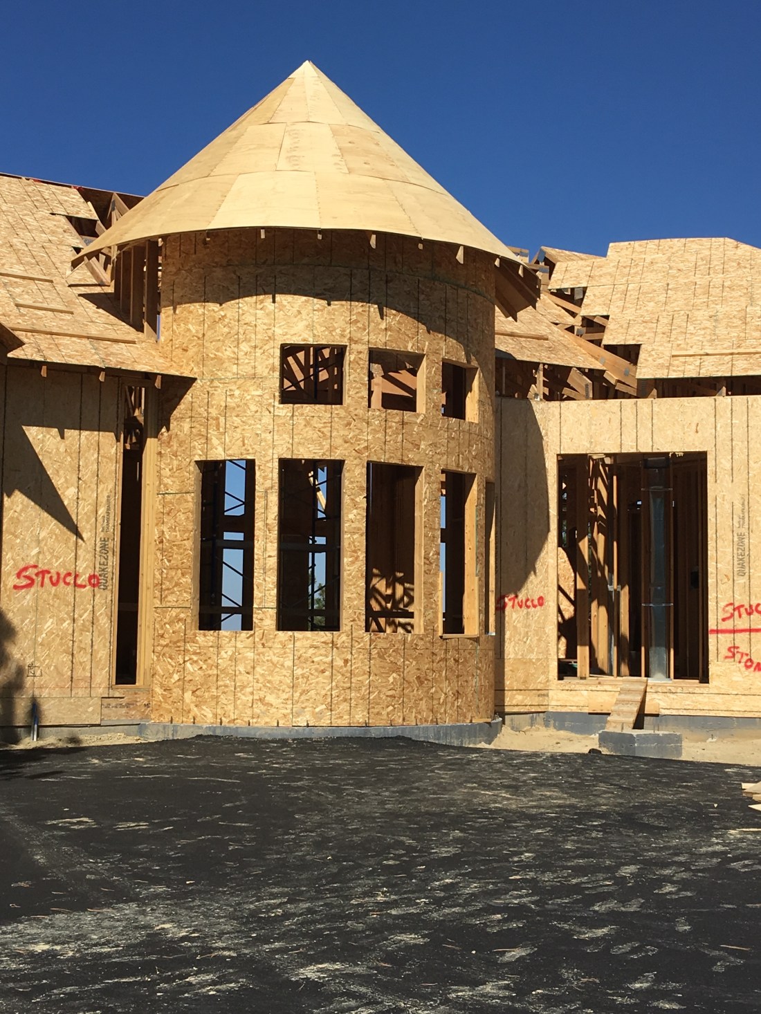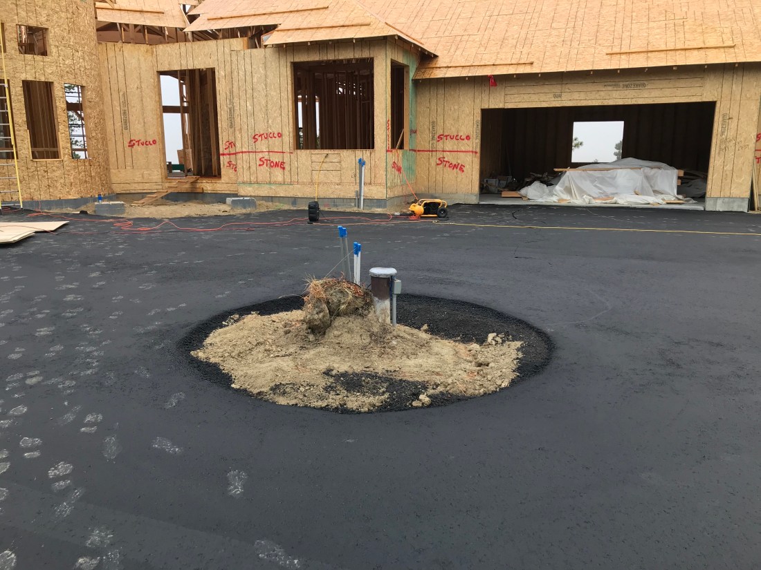 Changes are happening quickly at the site now. The house is really starting to show it’s character and design now. We arrived to see the entry road and roundabout black top completed and the turret roof close to completion. All ducting for HVAC is done, with plumbing and electrical to start very soon. The beautiful structural truss beams are in place and windows are on site to be installed within days. Once that is well underway, the front door and garage doors will be delivered. Roofing is underway, so all these pieces coming together means we are weeks away from being “dried in”….meaning the house is sealed from the weather and can even be heated. You can see our well head in one picture below–it’s at the center of the roundabout. The well pump will be lowered and this round area will have a rock wall build to create a planting area (or maybe a place for a cool statue?)