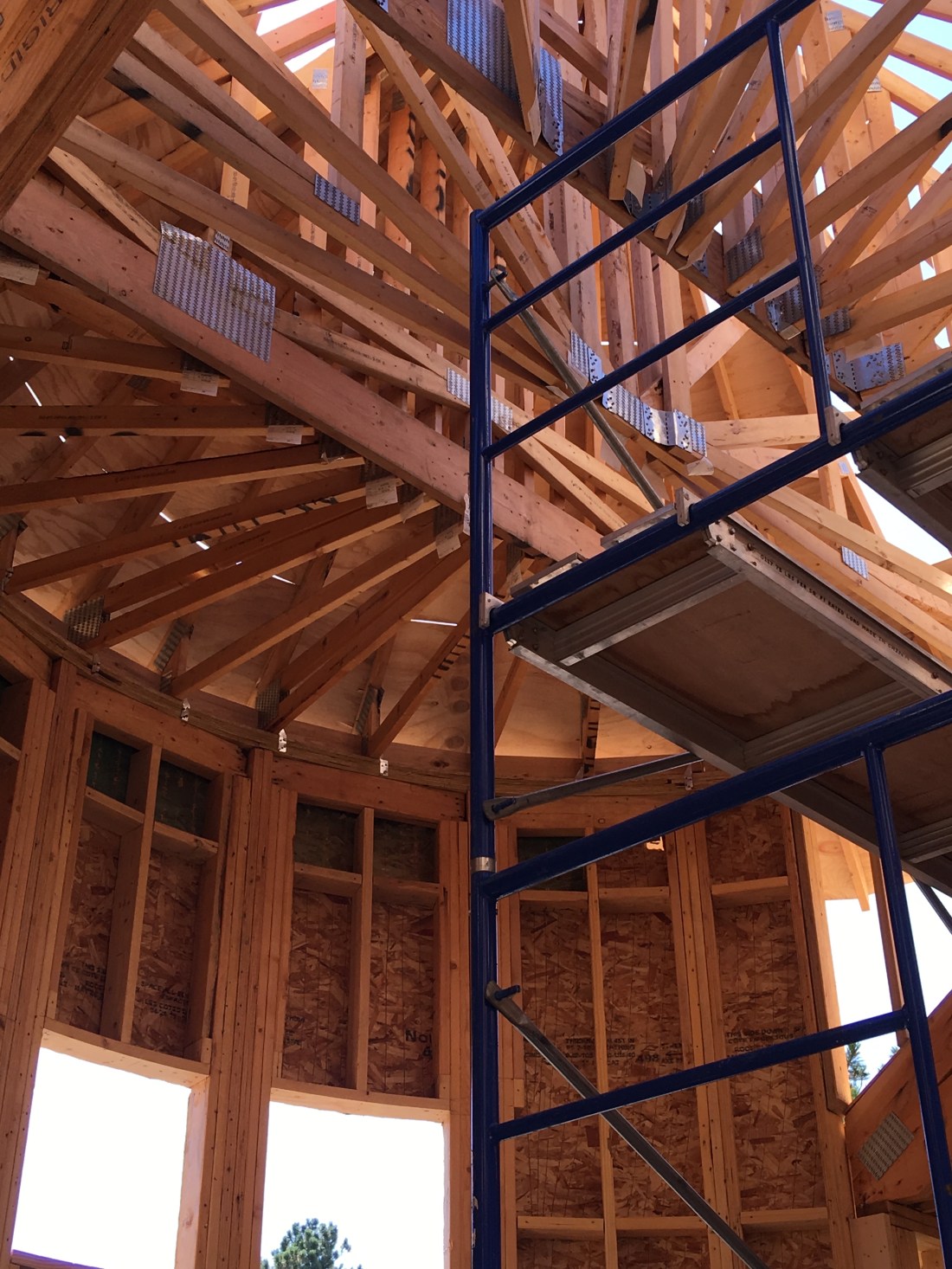 The sky today was clear and the view magnificent. The facade of the house is showing the character of the design. We have stairs installed and the roof trusses are going up 👍👍😝😁😁