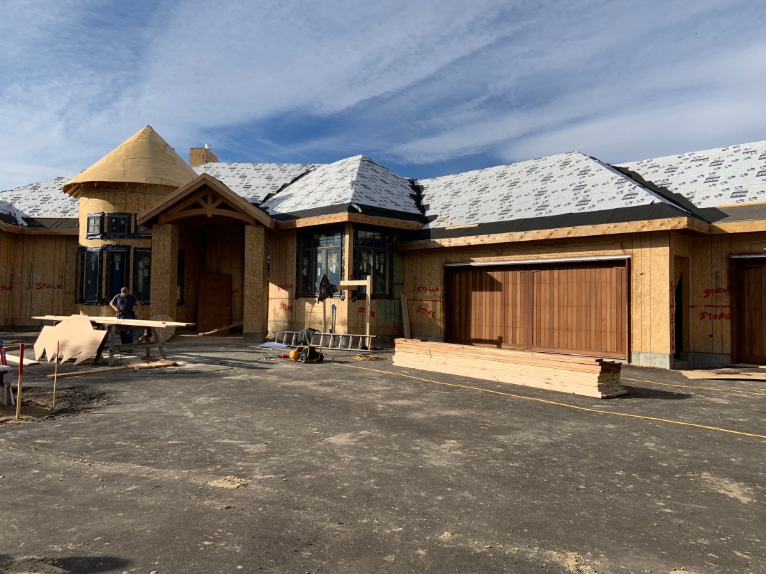 We had a bit of a delay due to the truss arrival taking longer than expected plus the turret outer wall had to be rebuild. Everything now should move ahead rapidly as the push to get the house weather tight begins–that includes all exterior doors, exterior stucco and stone work, all windows and, of course the roof.